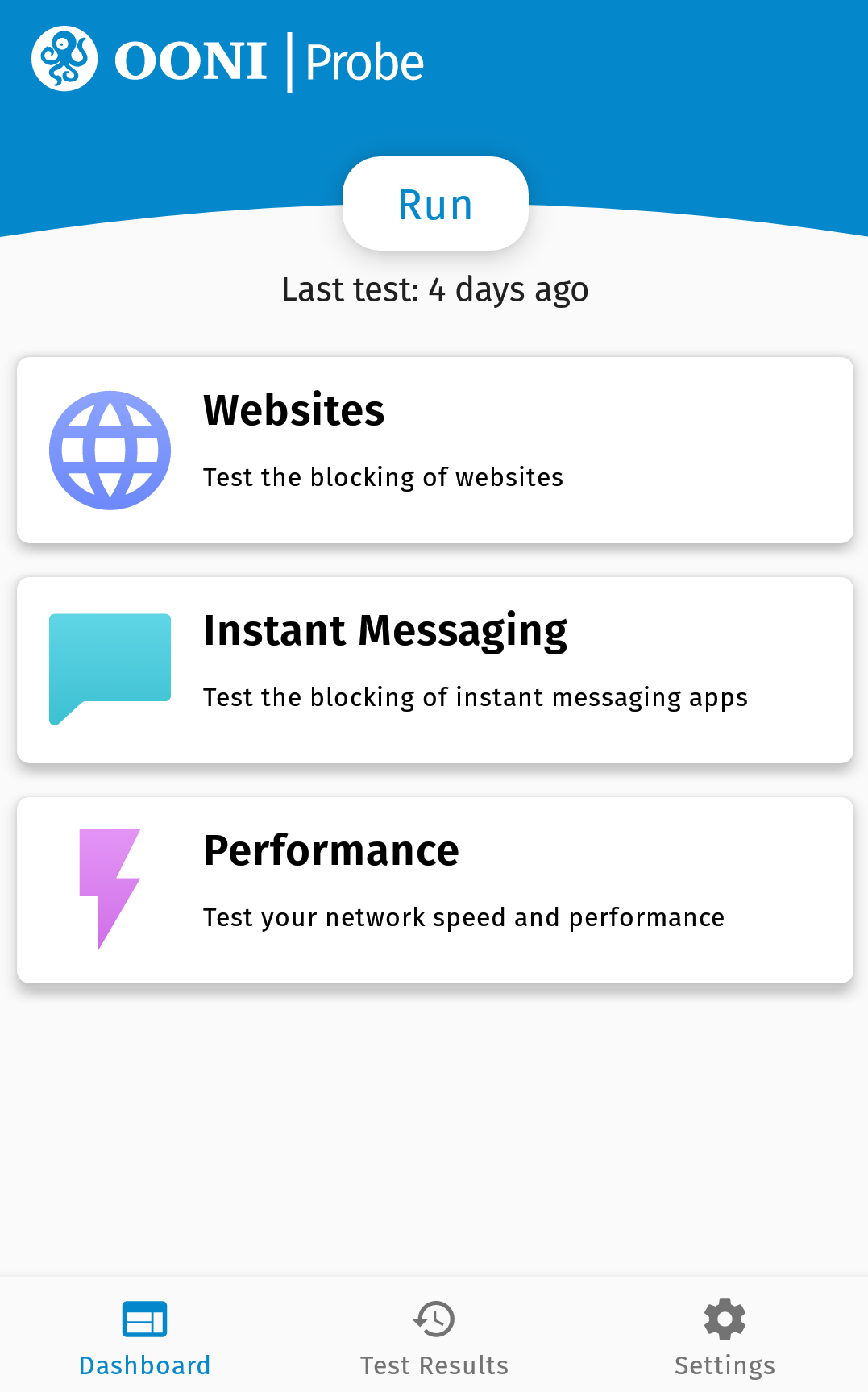 OONI Probe tətbiqin idarə panelində “Run”/”test et”