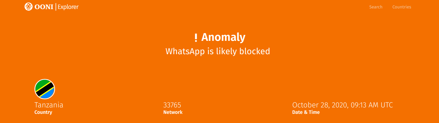 The blocking of WhatsApp in Tanzania is further suggested by OONI Probe