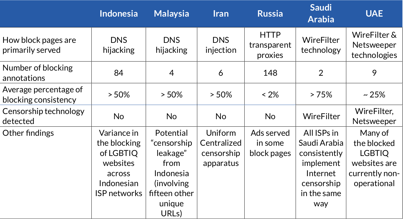 LGBTIQ websites on “culture and community” were blocked most often. In Indonesia, Iran, Malaysia, and Saudi Arabia, the most