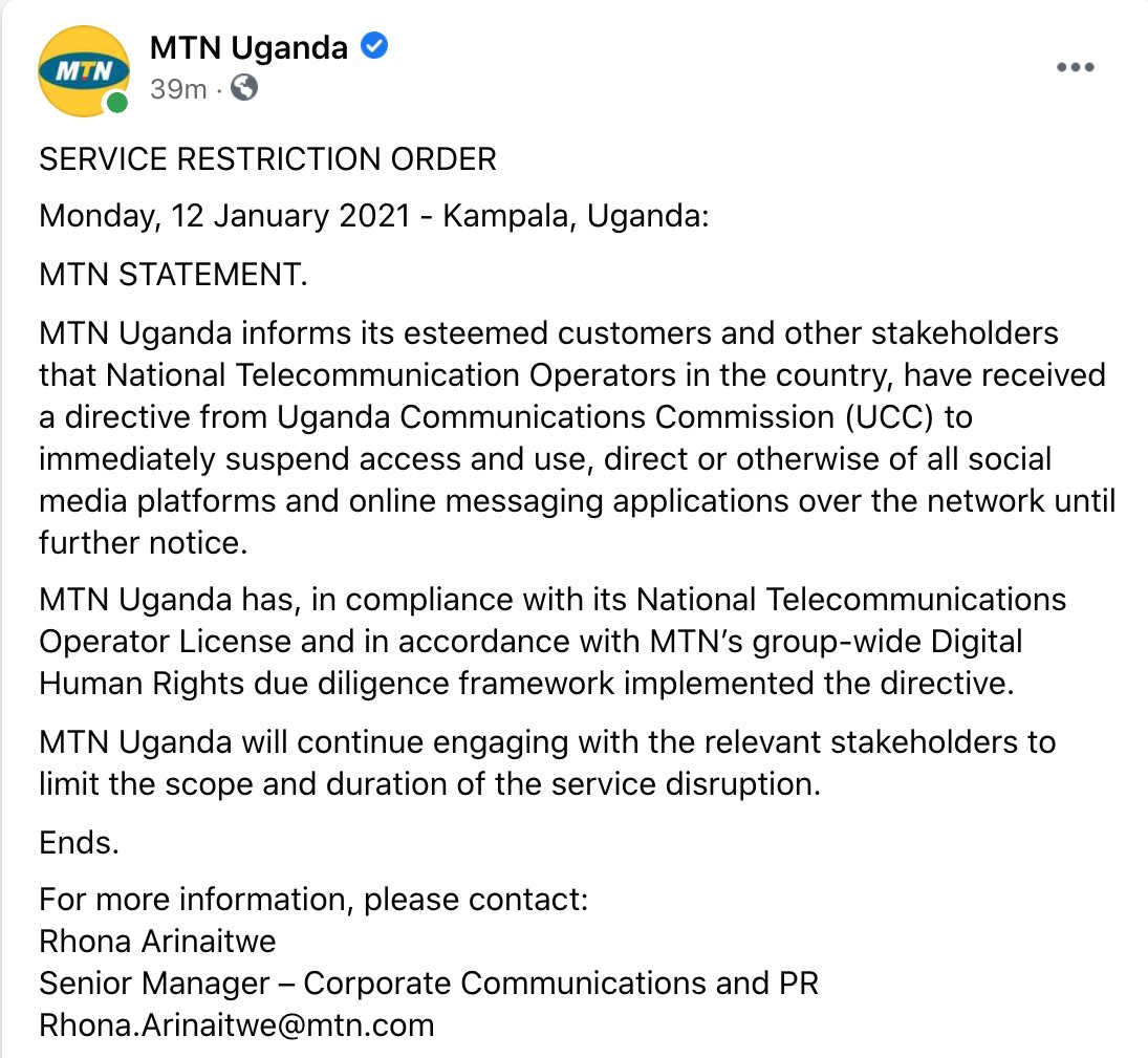 On 12th January 2021, Ugandan ISPs