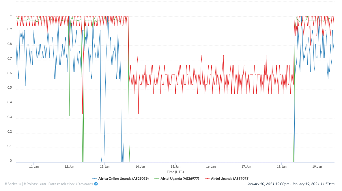 networks in Uganda; we see that the outage began at around 16:00 UTC on