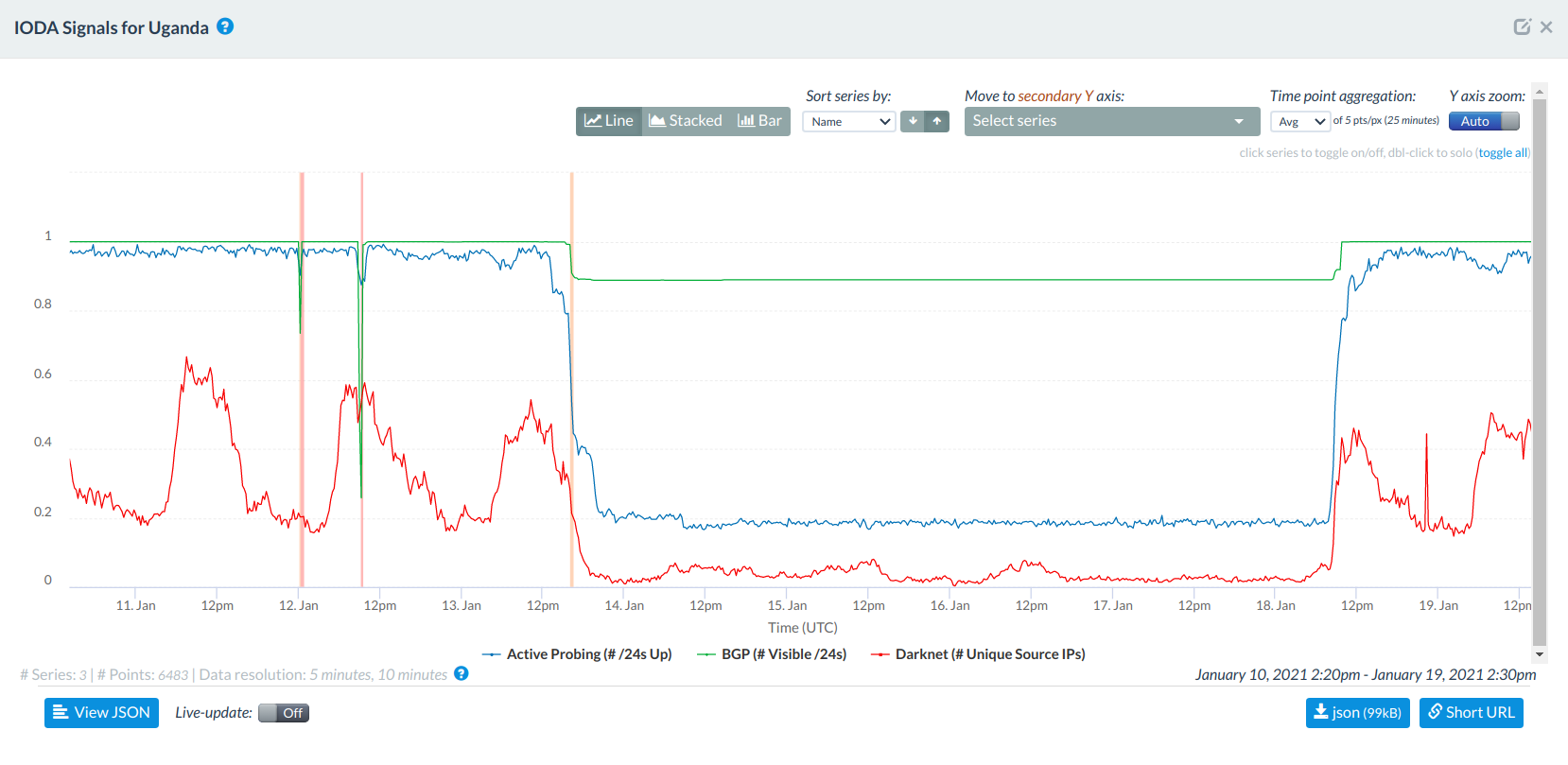 The graph above shows IODA’s BGP signals for the five networks from the