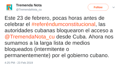But a few hours before the referendum, independent news outlet Tremenda Nota reported that their website got blocked in Cuba.