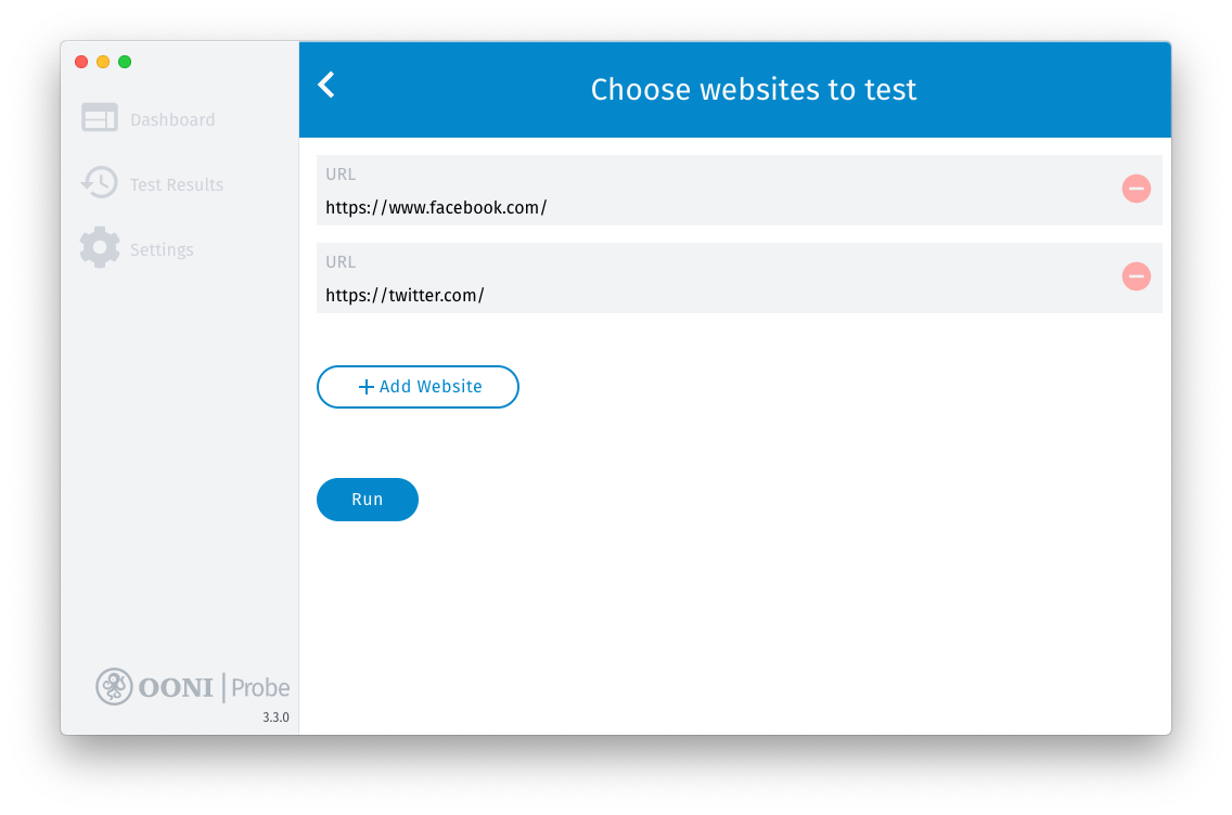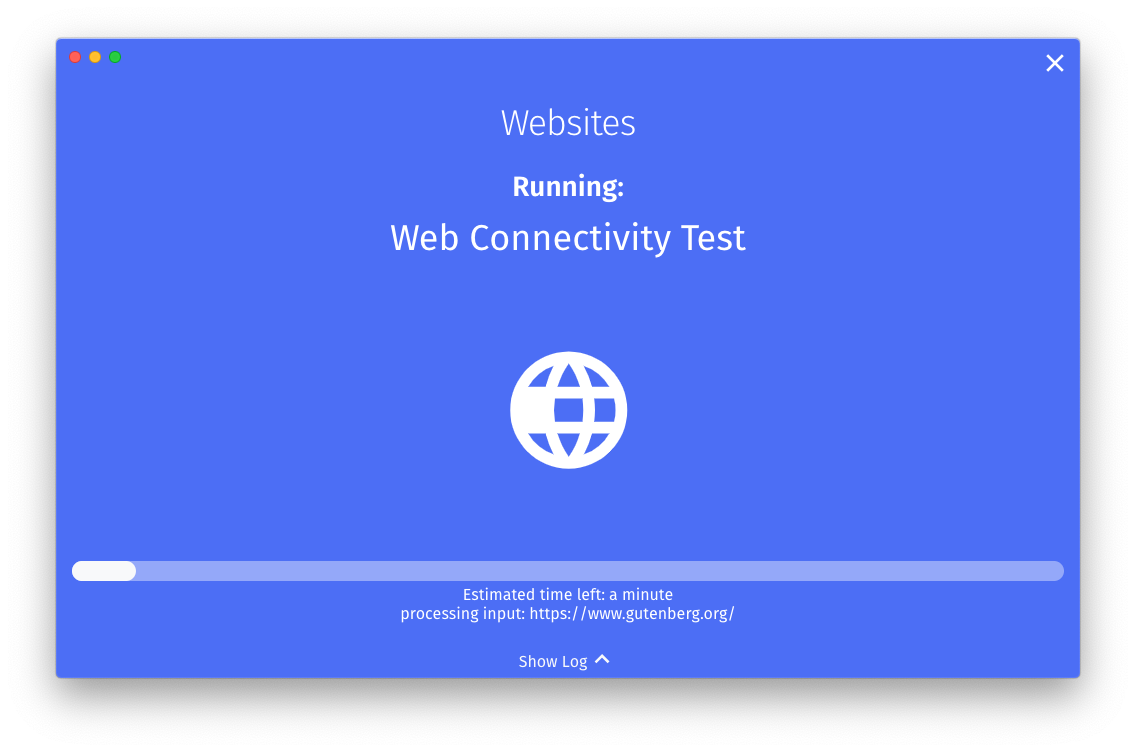 Note: OONI Probe will only test as many websites as it’s able to test within 90 seconds when you click “Run” (either from the Dashboard or from the Websites card). These websites (which are tested within 90 seconds) are randomly selected from the global and (relevant) country-specific test lists. Every time you click “Run”, you will test a different, random selection of websites (from the global and country-specific test lists) within 90 seconds. Therefore, the more times you click “Run”, the more websites you will test.
