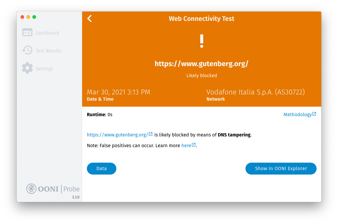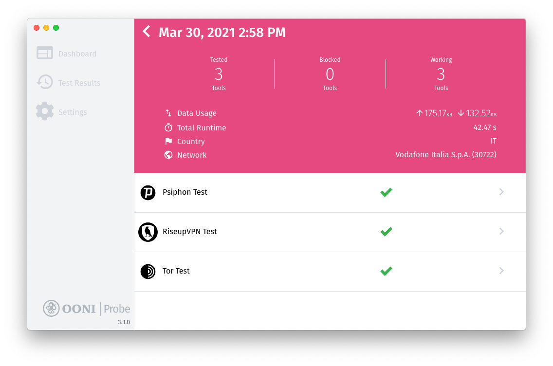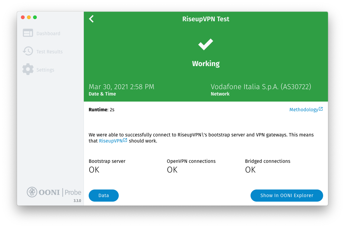 In this case, we can see that RiseupVPN was reachable when tested on Vodafone Italia (AS30722) on 30th March 2021 at 14:58 local time. This conclusion is reached because OONI’s RiseupVPN test was able to successfully connect to RiseupVPN’s bootstrap server and VPN gateways.