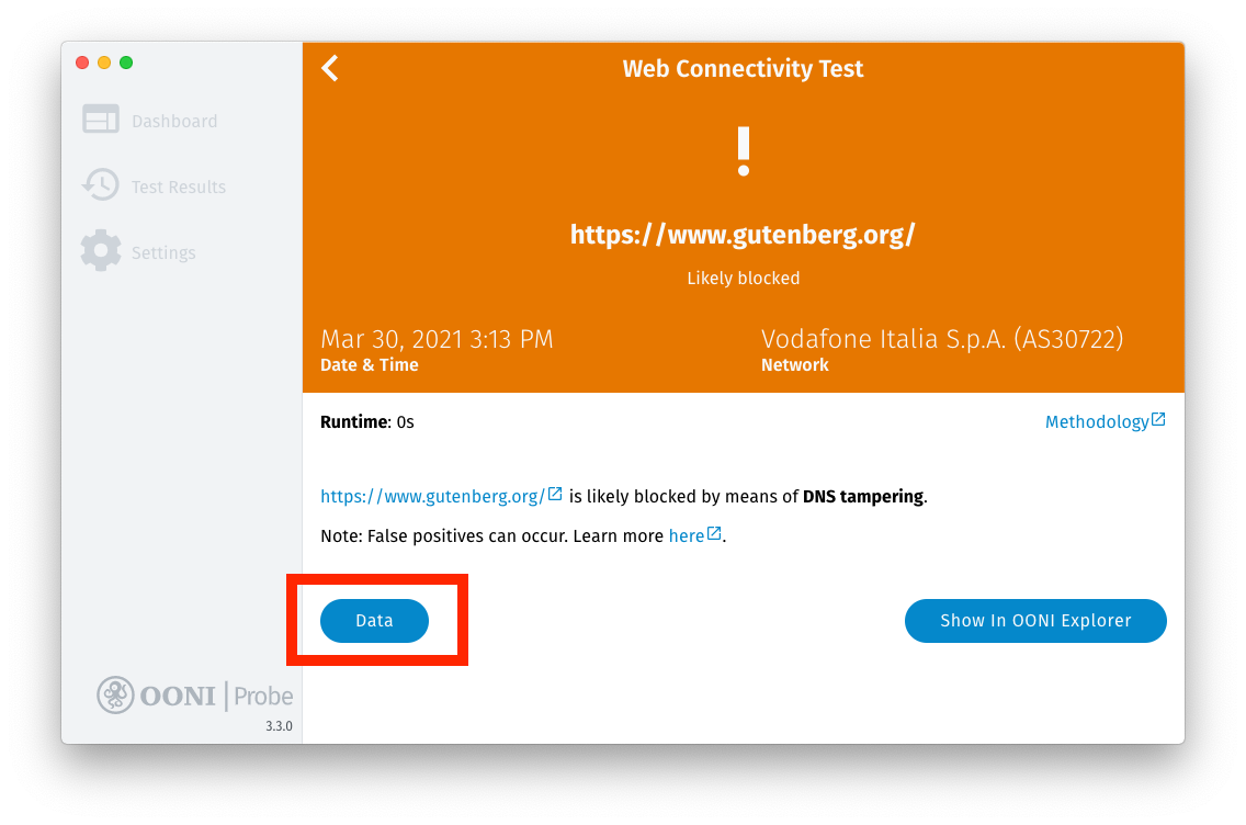 Every OONI Probe test result provides an overview of the findings. The actual data (i.e. the raw measurement data) that each test result is based on is available through the Data button on each test result screen.