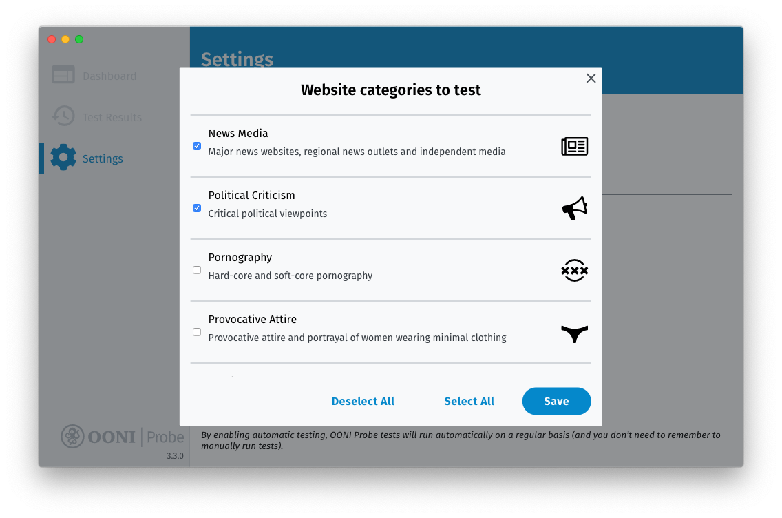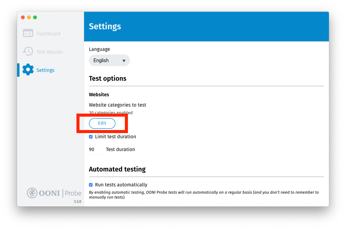 You can customize your use of OONI Probe through the settings.