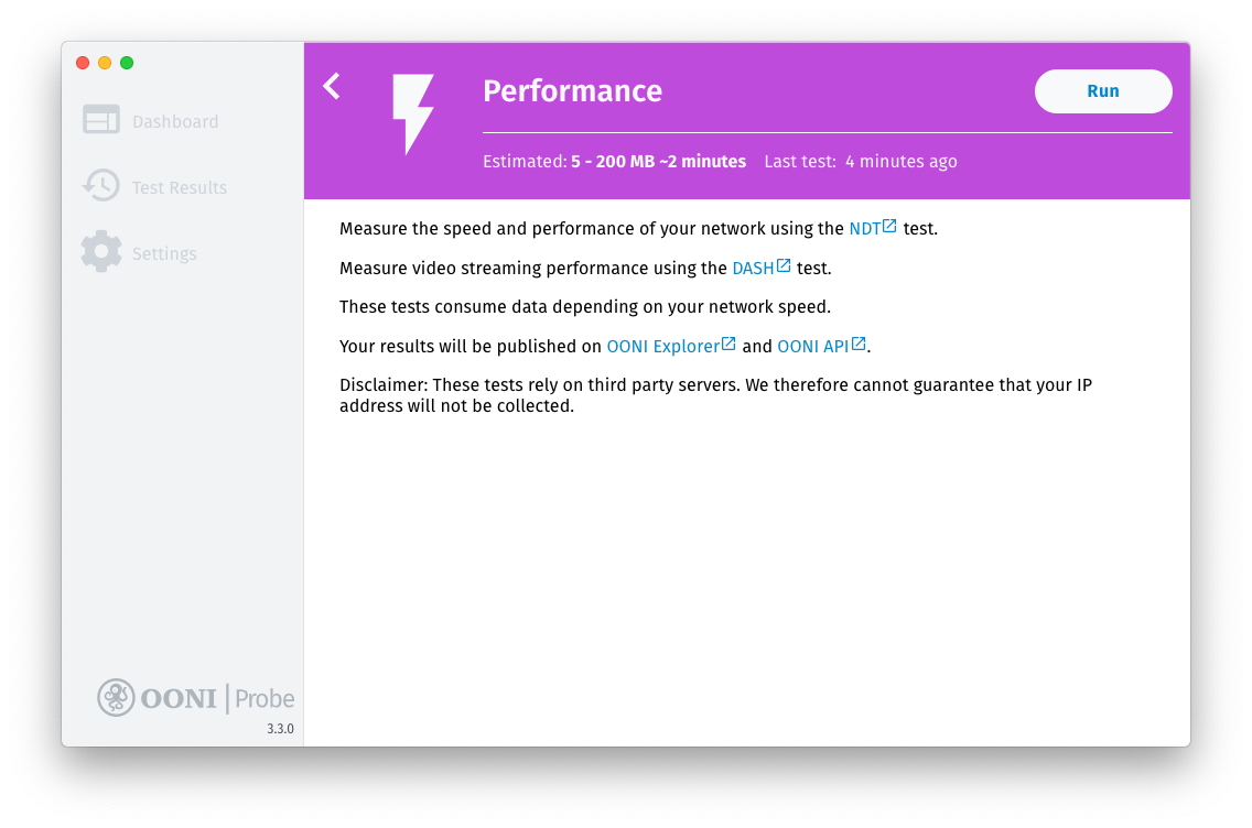 Step 1. Click Run to run your first OONI Probe tests.