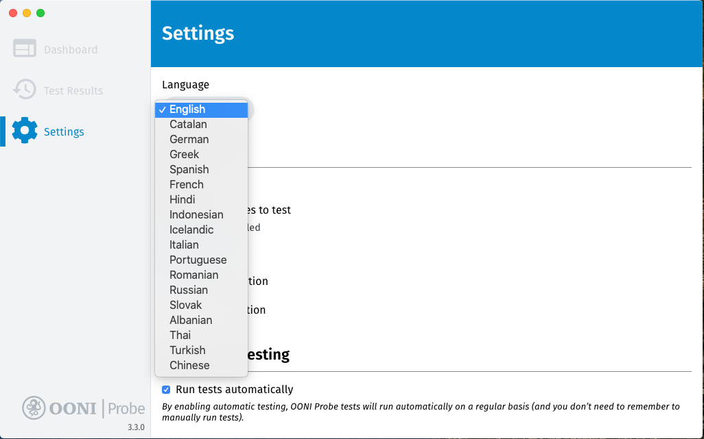Your OONI Probe desktop app has now switched to the language that you selected.