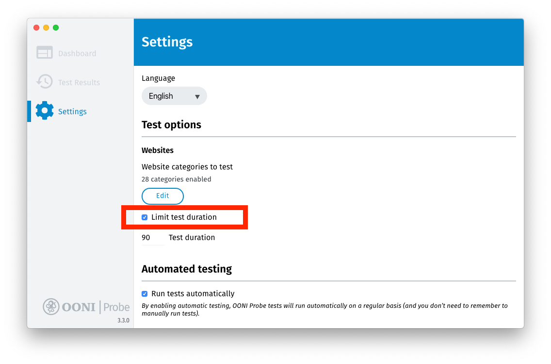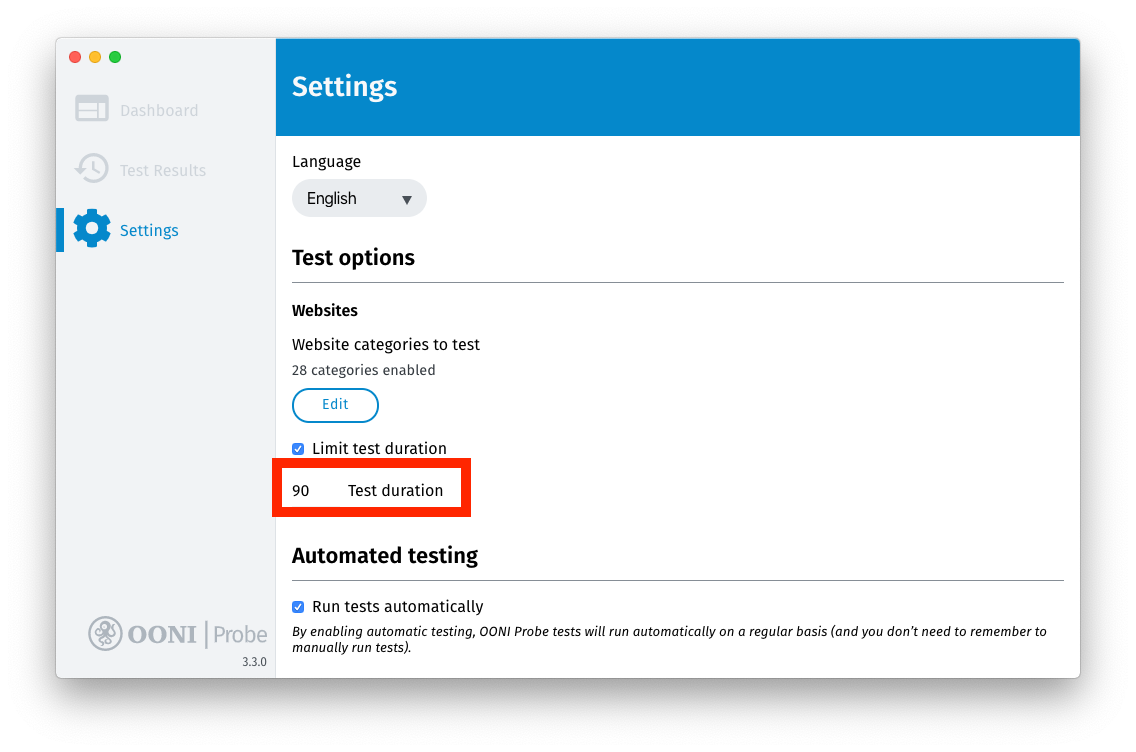 The automated OONI Probe testing settings have already been covered in previous sections of this guide. Please refer to the “Automated OONI Probe testing” section.