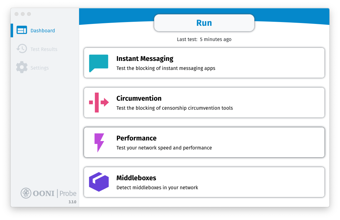 The Dashboard of the OONI Probe desktop app includes 5 cards, each of which entails OONI Probe tests:
