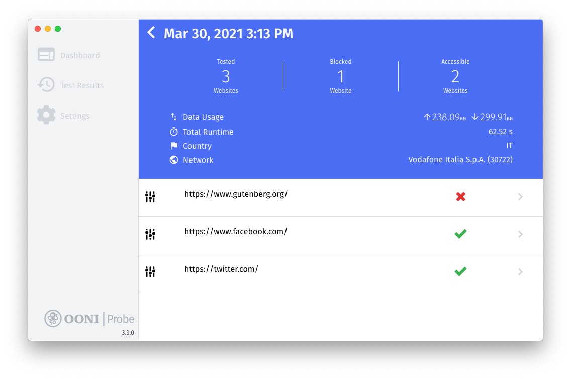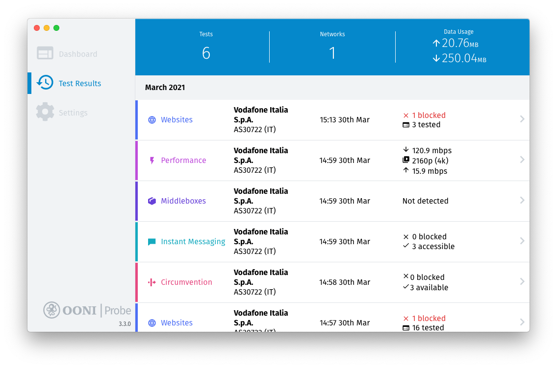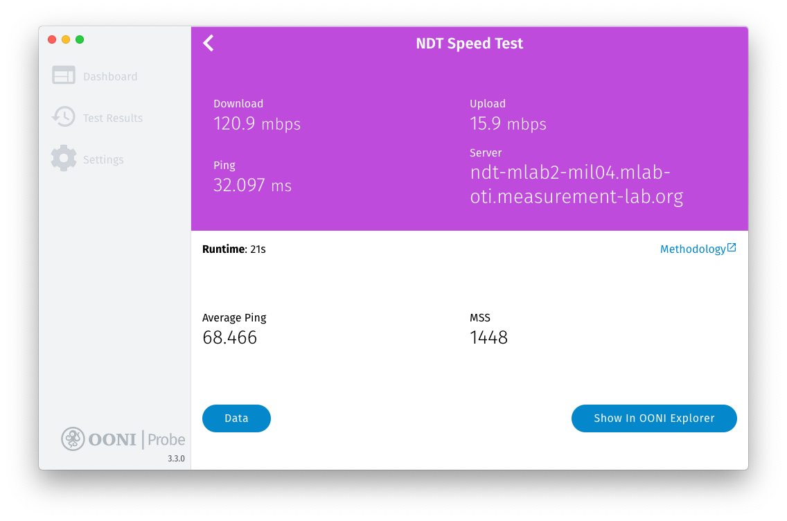 Your OONI Probe test results will automatically get published on OONI Explorer and on the OONI API.