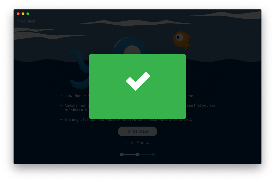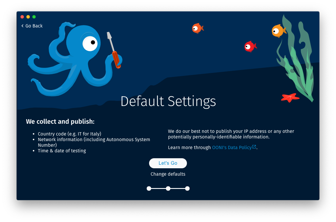 If you click the Let’s Go button, you will opt-in to sharing crash reports to help us improve OONI Probe.