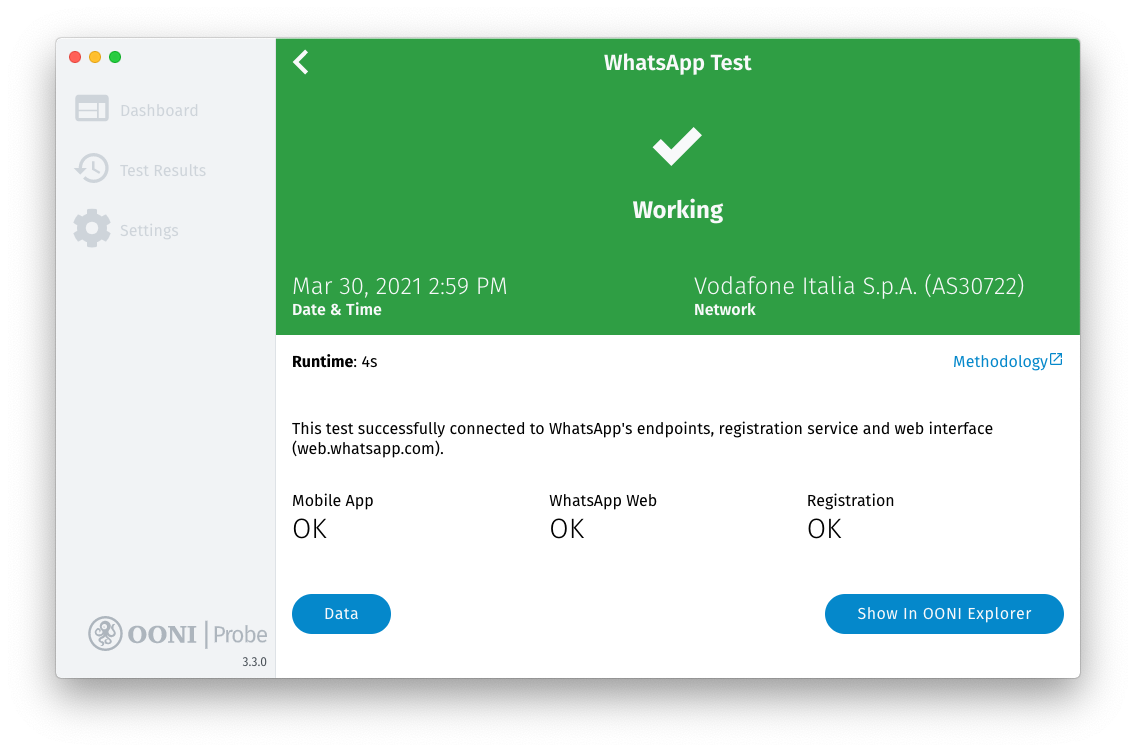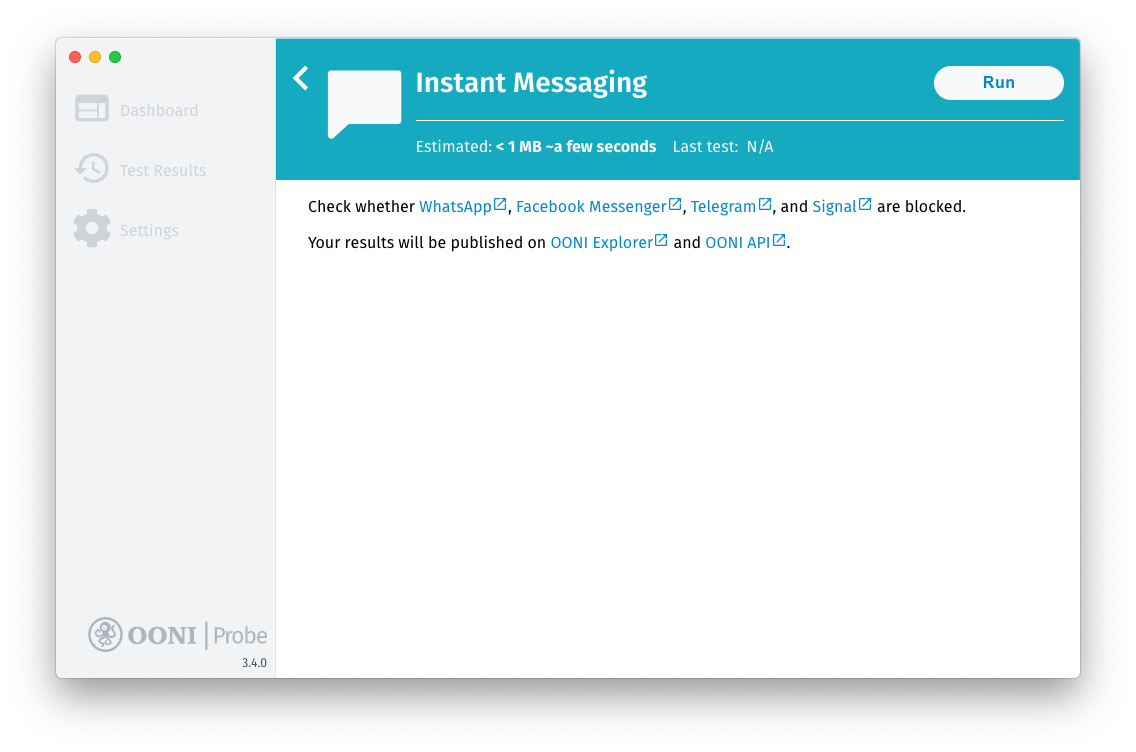 You are now running OONI’s WhatsApp, Facebook Messenger, Telegram, and Signal tests to measure the blocking of these apps.