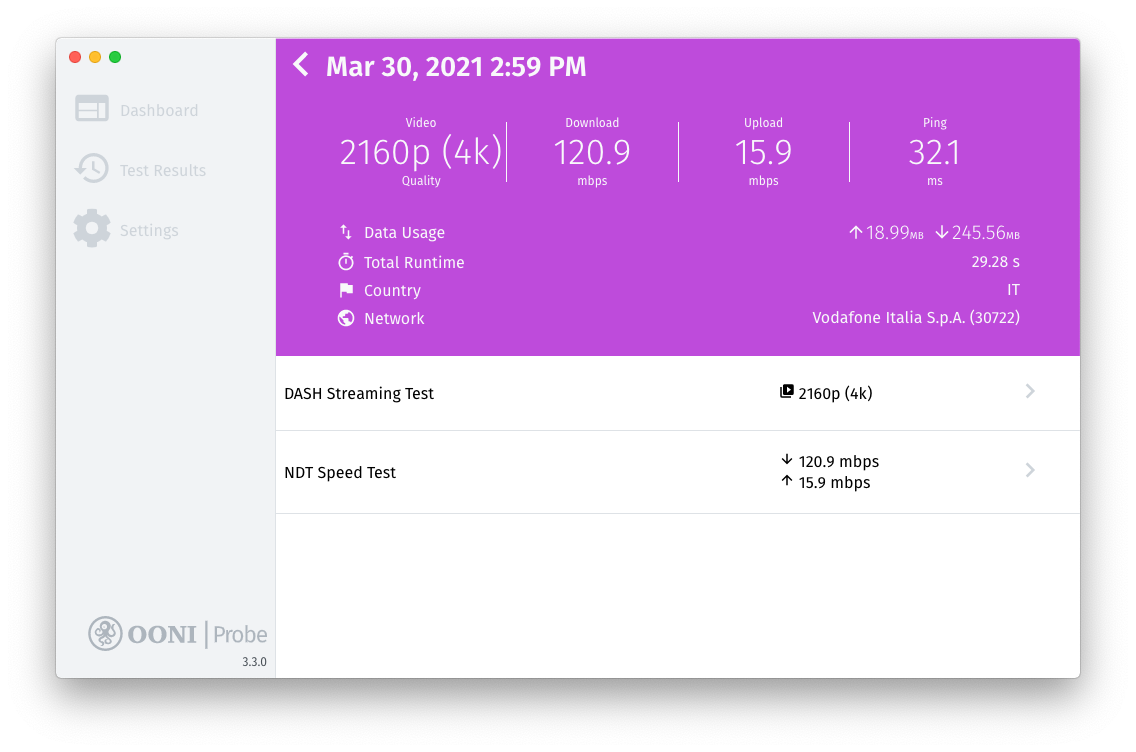In this case, we can see that a DASH video streaming test was run on Vodafone Italia (AS30722) on 30th March 2021 at 14:59 local time. When the test was performed, it was possible to stream up to 2160p (4K) video without buffering, with the median bitrate being 115.0 megabits per second. This indicates that the user could stream high definition videos on that network if the streaming server was co-located with the measurement server.