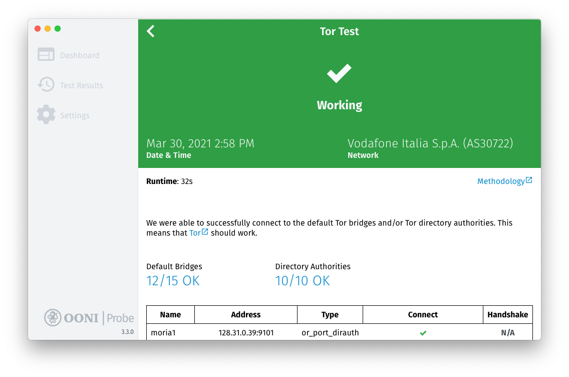 In this case, we can see that Tor was reachable when tested on Vodafone Italia (AS30722) on 30th March 2021 at 14:58 local time. This conclusion is reached because OONI’s Tor test was able to successfully connect to most of the default Tor bridges and to all Tor directory authorities.