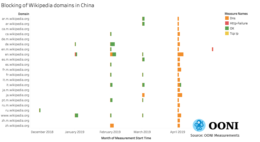 OONI的Web连通性测试(在OONI Probe应用程序中提供)旨在测量基于TCP/IP,HTTP和DNS的对网站的封锁。 通过此测试收集的网络测量数据显示,在以前,除了中文版之外的大多数维基百科语言版本以前都可在中国访问,中文版据报道自2015年5月19日以来一直被封锁。